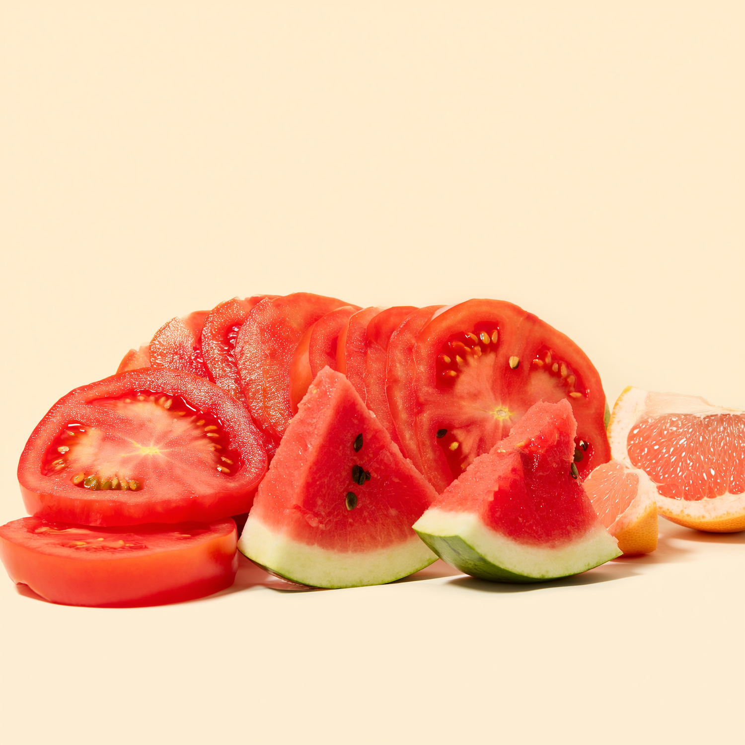 Lycopene is the vivid red pigment in tomatoes, watermelon and pink grapefruit. It is a fat-soluble carotenoid that settles into the skin’s lipid layers, where it helps neutralise UV-triggered oxidative stress and supports an even, calm look to skin. With steady intake it also contributes to a warmer, food-derived glow over time.