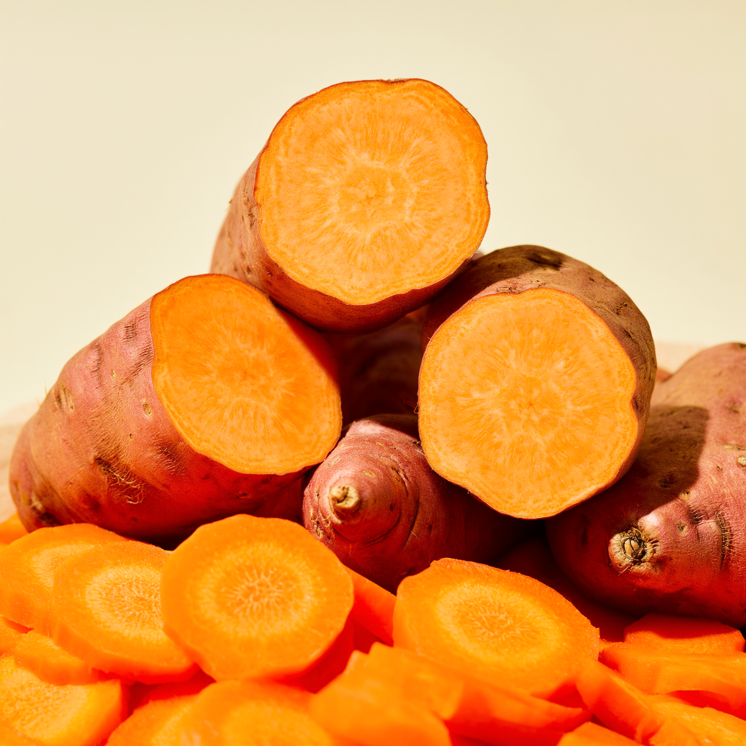 Beta-carotene is the orange plant pigment found in carrots and sweet potato. It’s a carotenoid your body can convert into vitamin A, which supports normal skin barrier function and epithelial health. Because it’s fat-soluble, small amounts settle into the outer skin layers where they help neutralise UV-triggered oxidative stress. Over time, that build-up also nudges skin tone slightly warmer to create a food-derived glow.